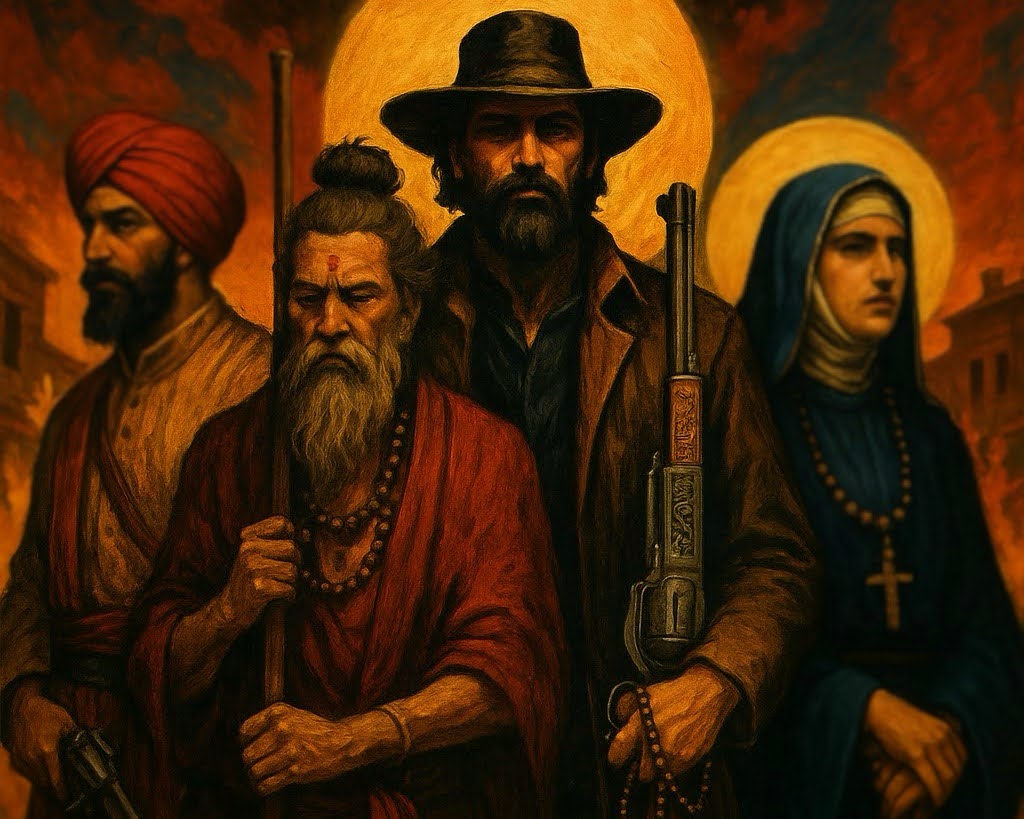 Your pilgrim might be a Tibetan monk in a duster, a Catholic penitent with a sawed-off, a Diné protector invoking Monster Slayer, an imam sighting down a lever-gun at worshippers of Shaitan, or someone whose beliefs and burdens are entirely their own.